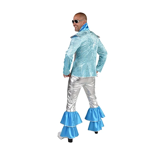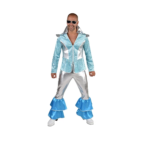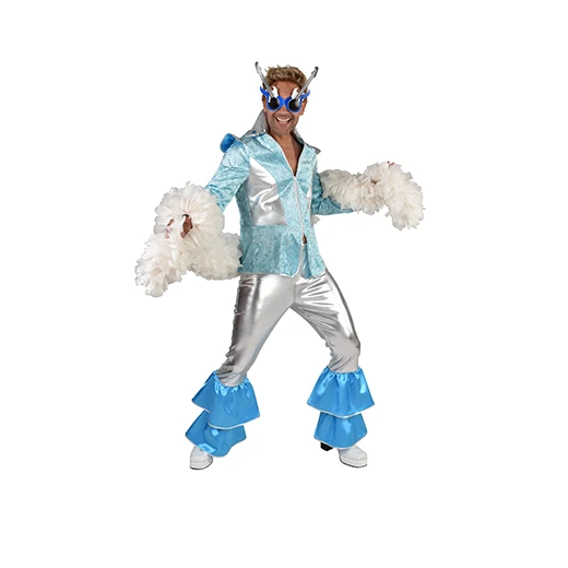 Disco kostuum Dancing king bestaande uit een blouse en broek. Bekende pakken van Mamma Mia musical en film.