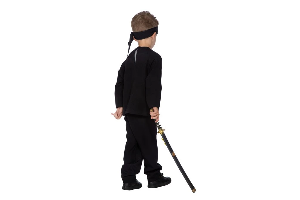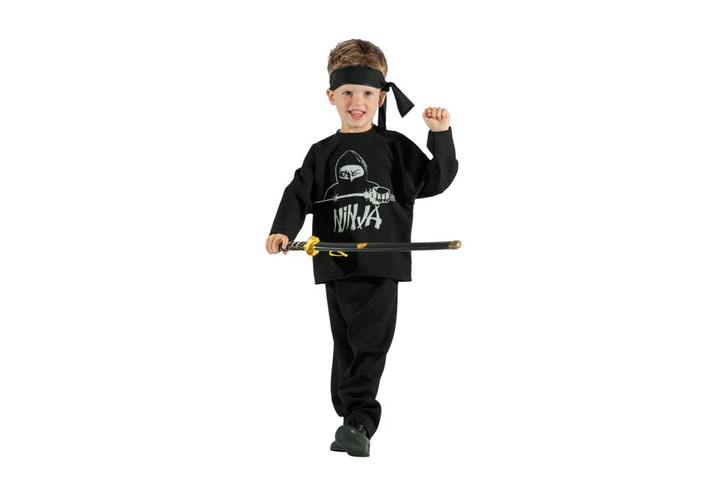 Black ninja kostuum bestaande uit broek, shirt en hoofdband.