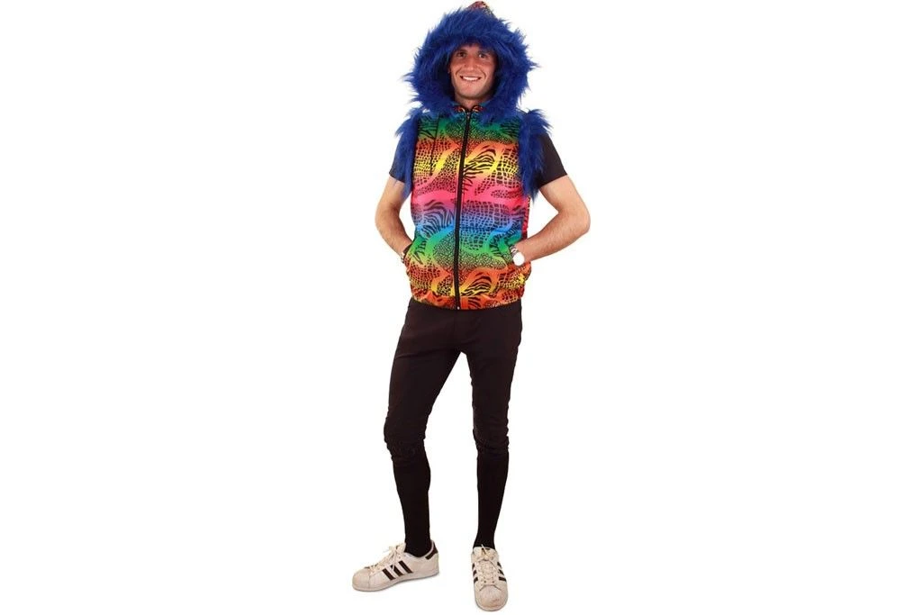 Bodywarmer 80s proud to be fout. Leuk voor een foute apres ski party. In regenboog kleuren en panterprint.