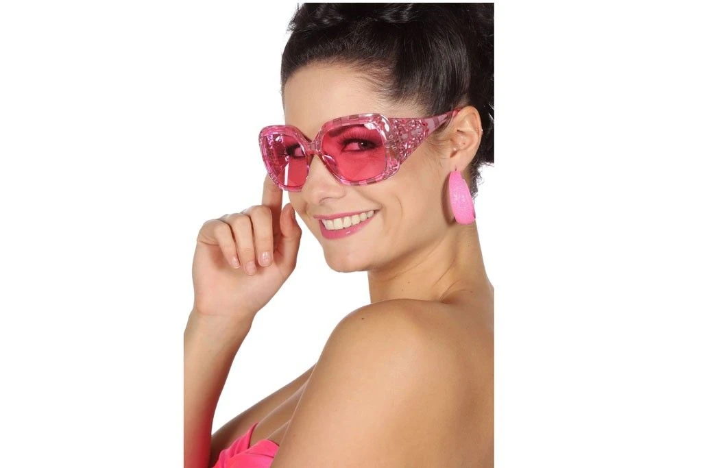 Roze glamour glitter bril. Leuk bij diverse thema feestjes zoals Disco, Hippy of Rock en Roll.
