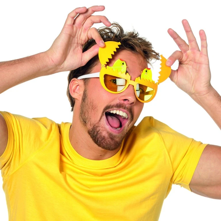 Bril met kuiken dat uit een ei komt in de kleur geel.