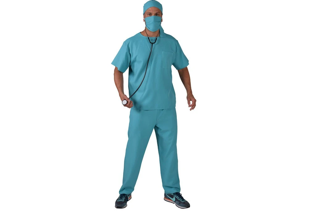 Chirurg kostuum, bestaande uit een broek, shirt, mutsje en mondkapje.