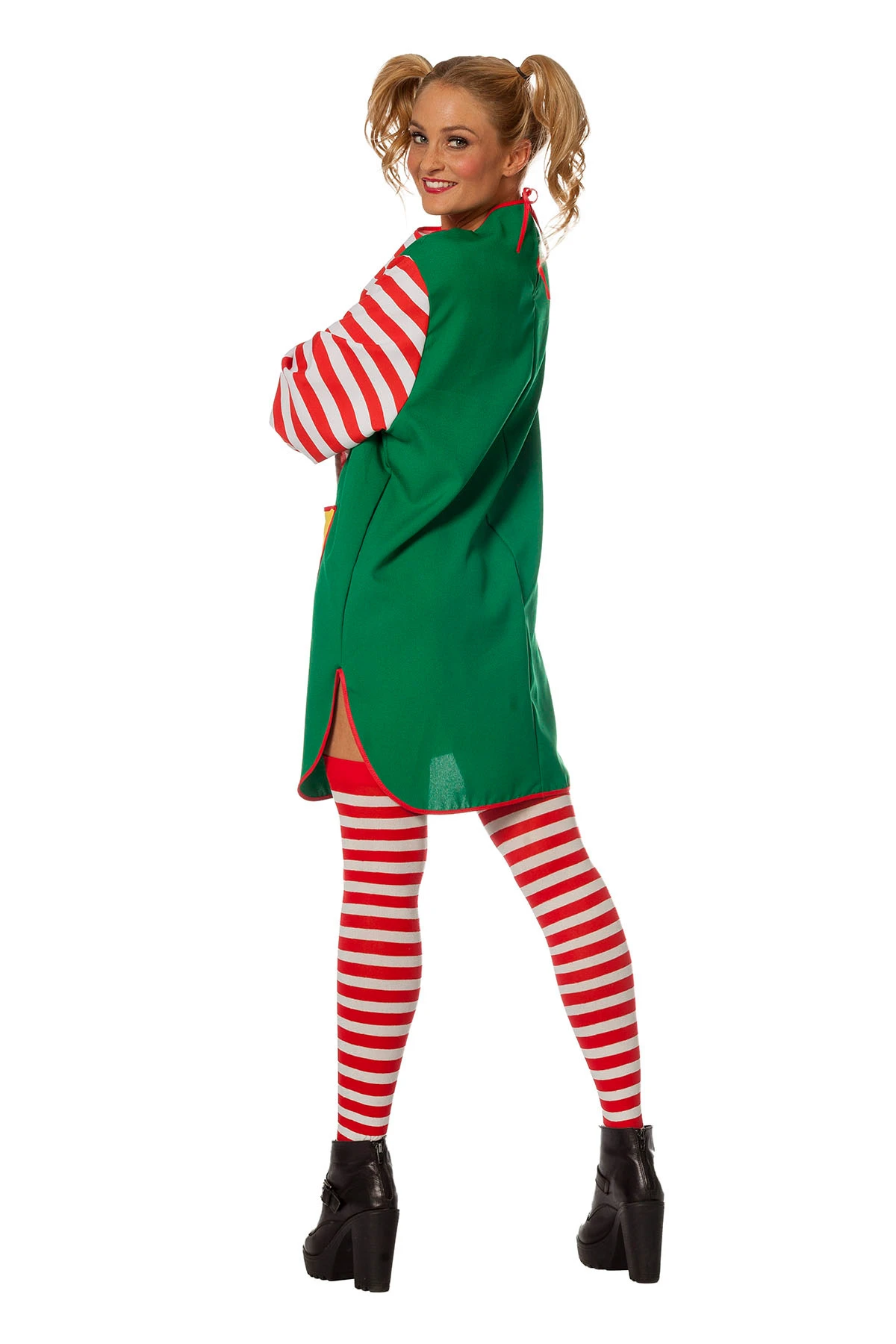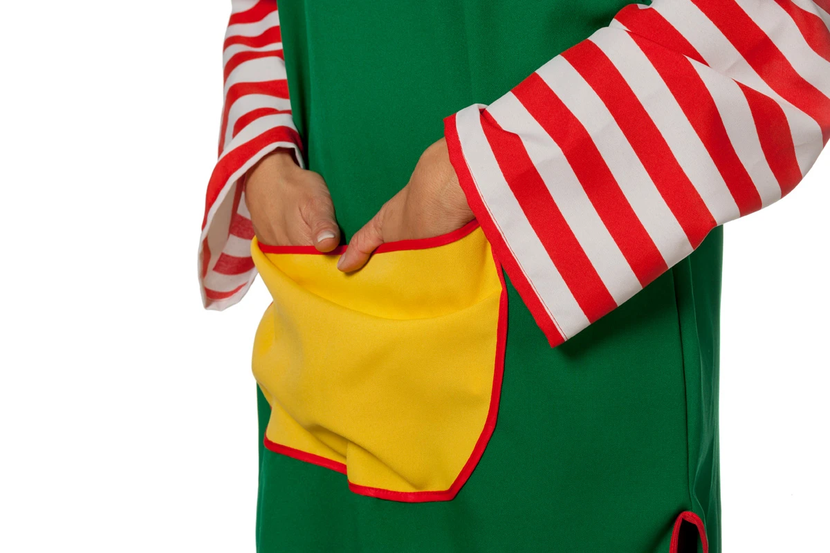 Groen pippie langkous jurkje met lange rood wit gestreepte mouwen.