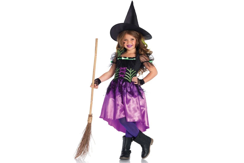 2 Delige Spinnenweb heks, bestaande uit een jurk met een aflopend lange achterkant, een tulle laag met glittersterren over de rok, een spinnenwebprint van glitters op het lijfje en bijpassende heksenhoed.