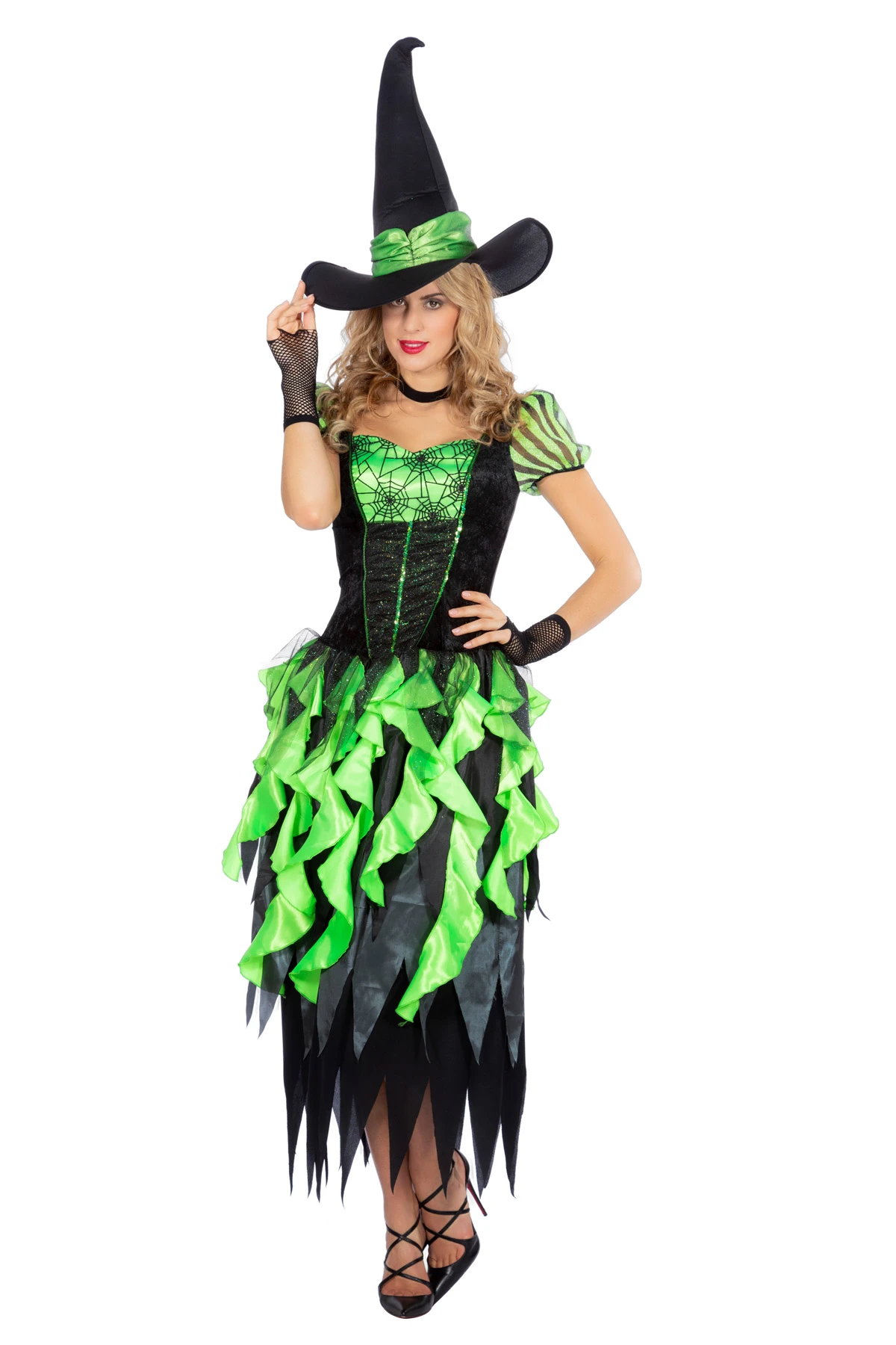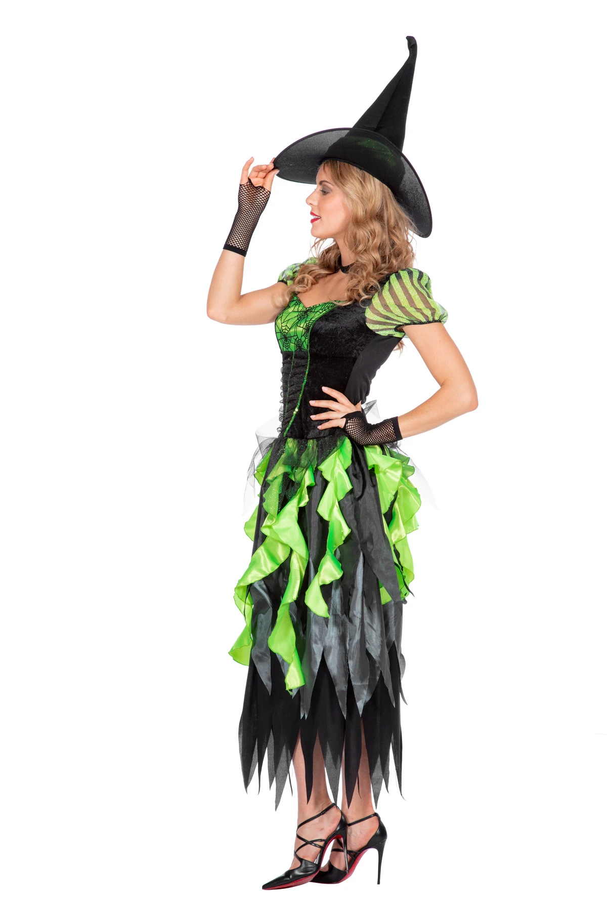 Mooie heksenjurk in zwart en groen bestaande uit jurk, hoed en halsband
