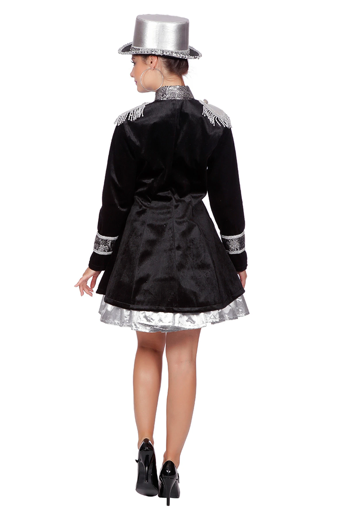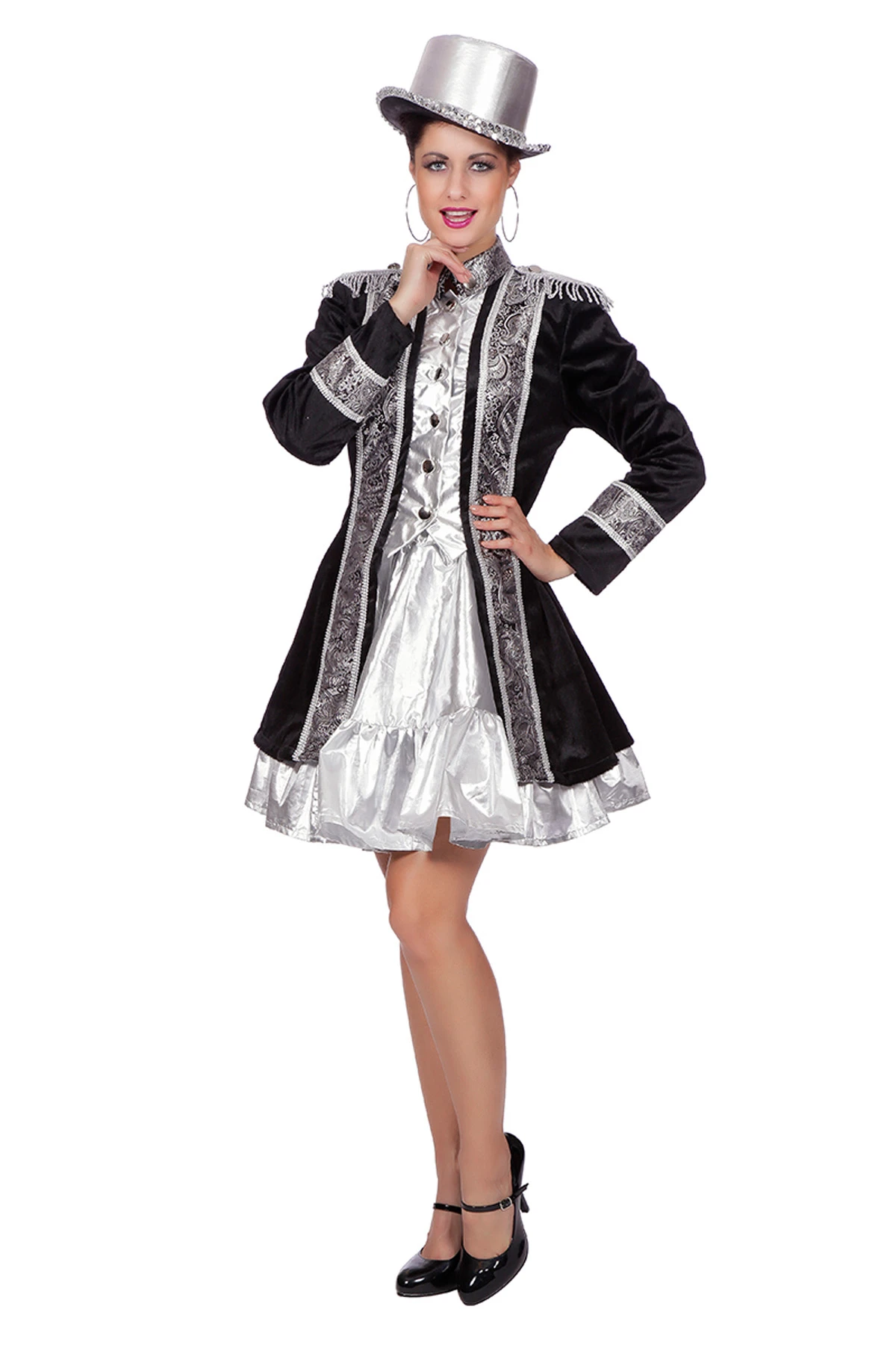 Zwart dames glamour jas met zilveren accenten. Carnavalsjas vrouwen fluweel.
