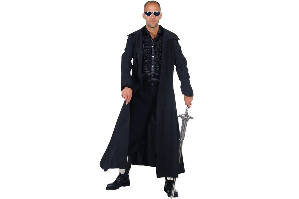 Stoere lange zwarte heren jas, mooie kwaliteit. Geschikt voor diverse thema’s.