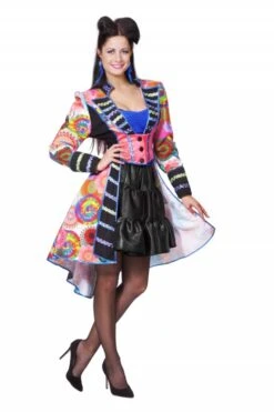Gekleurde jas met een langere achterzijde. Leuk met een petticoat eronder.