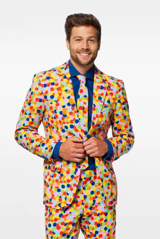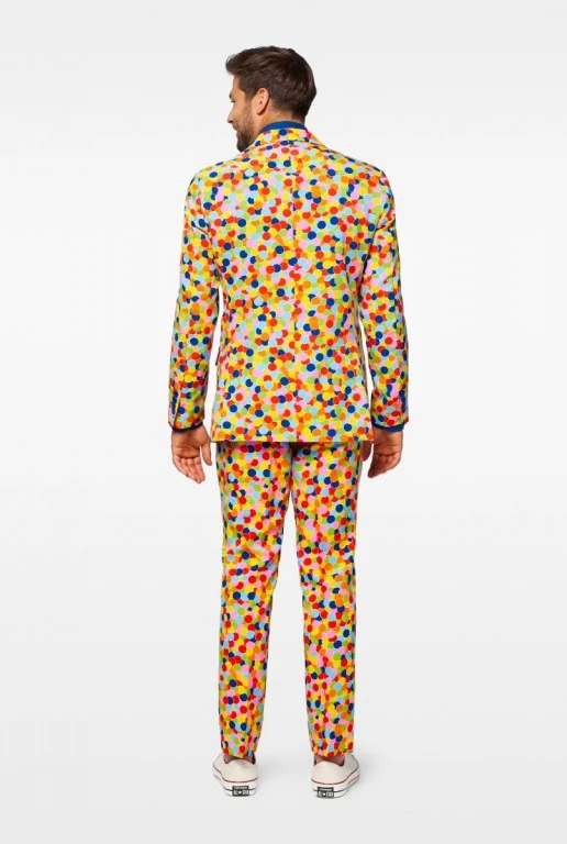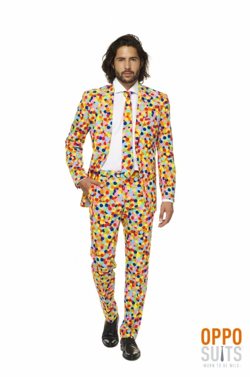 Opposuits Confetteroni official, bestaande uit broek, jas en stropdas.
