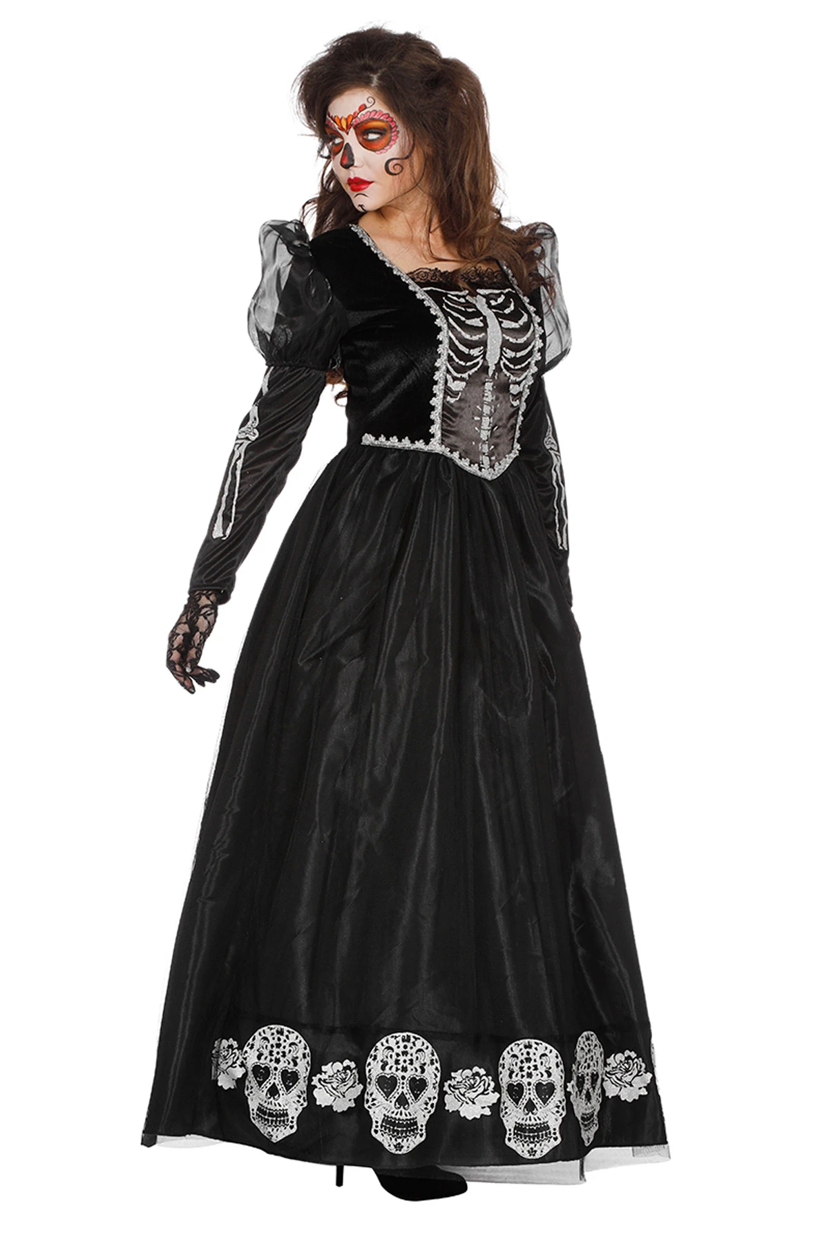 Zwarte lange jurk met skul print aan de onderzijde. Leuk voor halloween en carnaval.