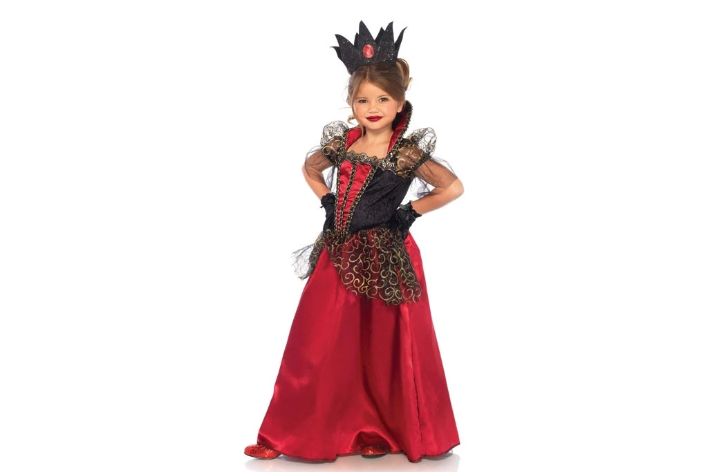 2 Delig Deluxe Rode Koningin, bestaande uit een satijnen maxi jurk met een glitter tule laagjesaccent, pofmouwen, opstaande kraag en kroon met glitters. Het lijfje van de jurk is afgezet met gouden kanten details.