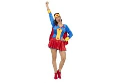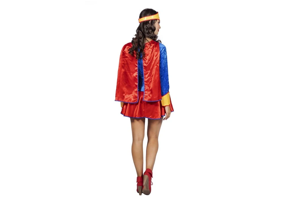 Wondergirl jurkje, rood met blauw en geel. Bestaande uit een jurk met cape en een hoofdband.